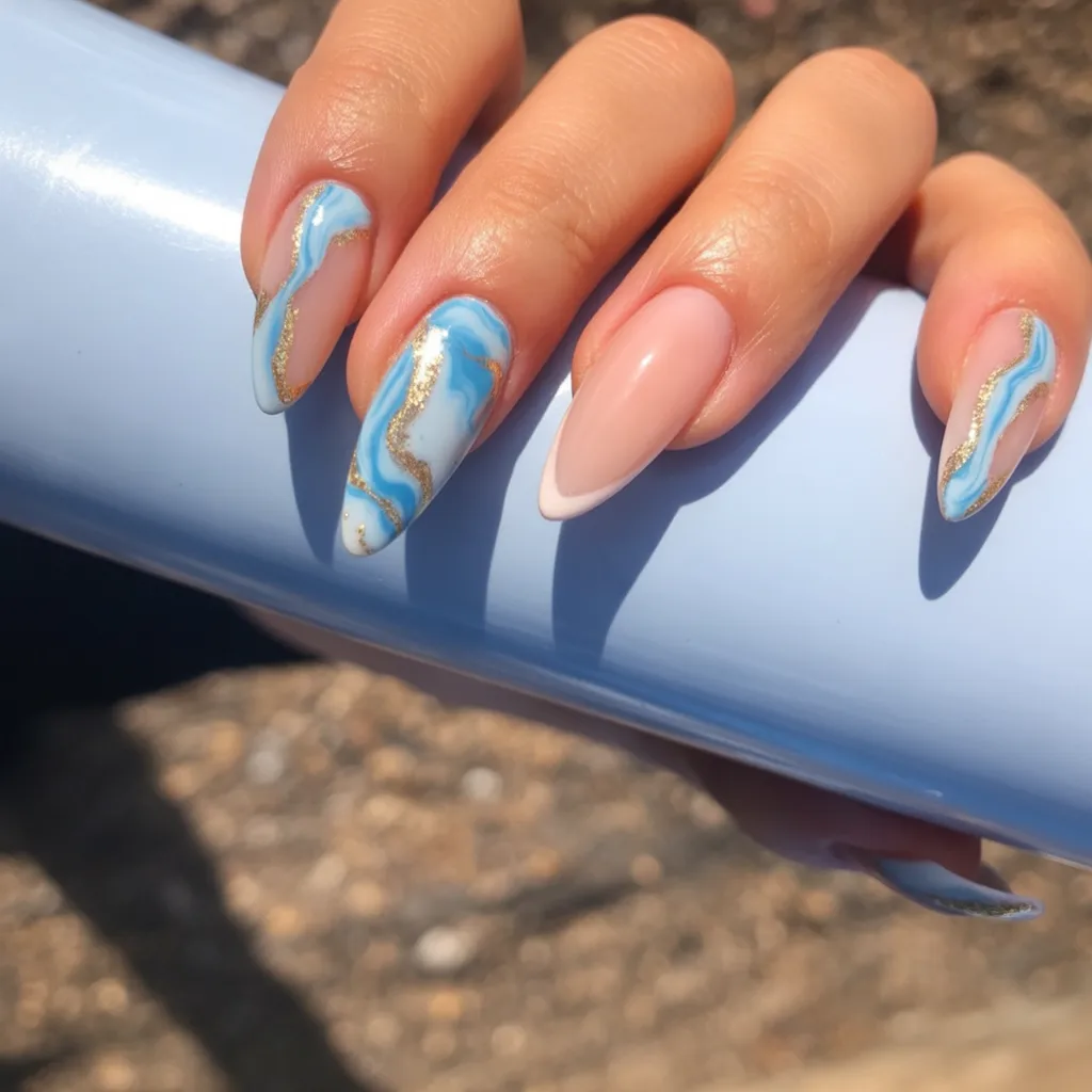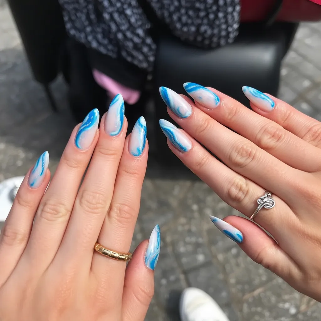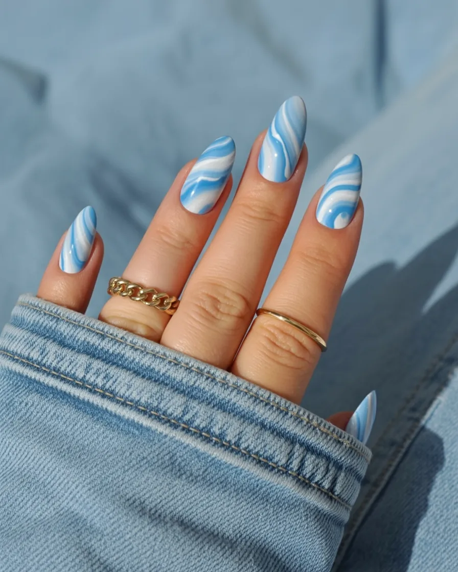 6. Soft Blue Swirl Almond Nails
