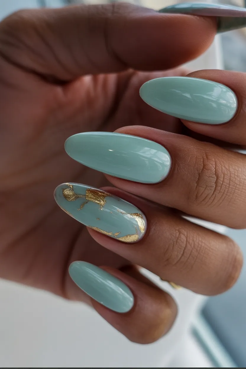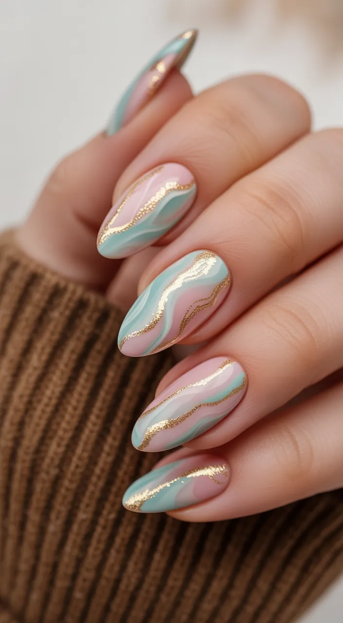 19. Mint and Blush Marble Almond Nails with Gold Lines