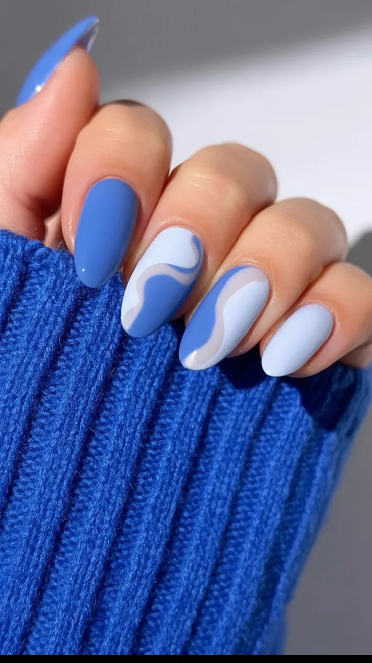 14. Abstract Blue Wave Almond Nails