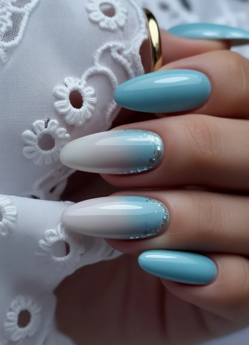 10. Blue Ombre Almond Nails with Soft Sparkle
