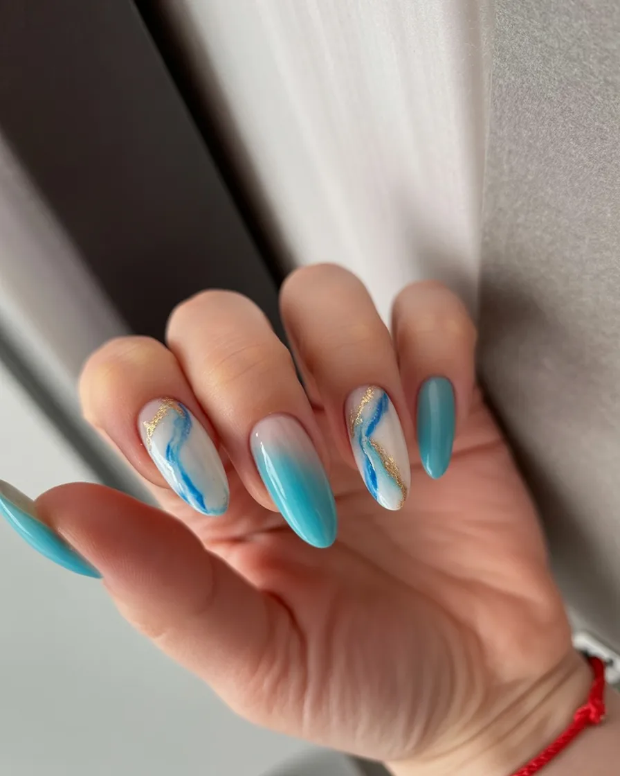 13. Blue Marble Art Almond Nails with Gold Veins