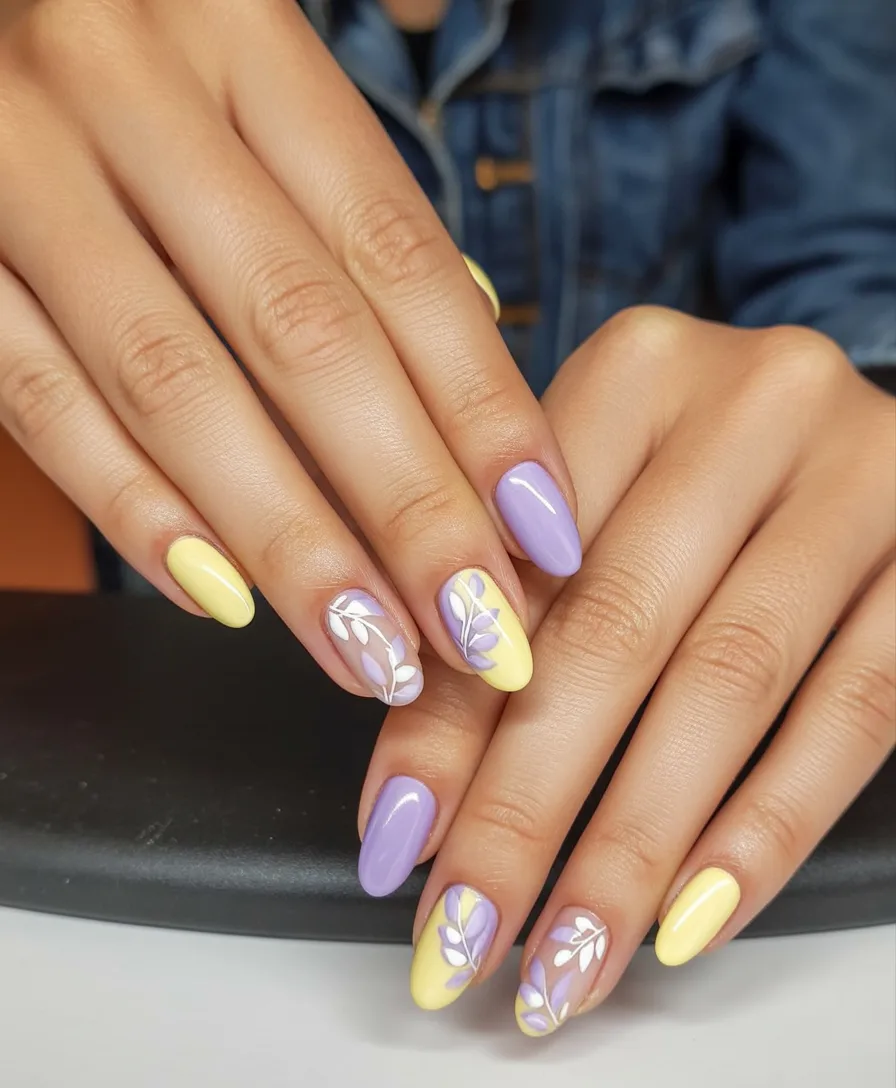 17. Yellow and Lavender Floral Almond Nails