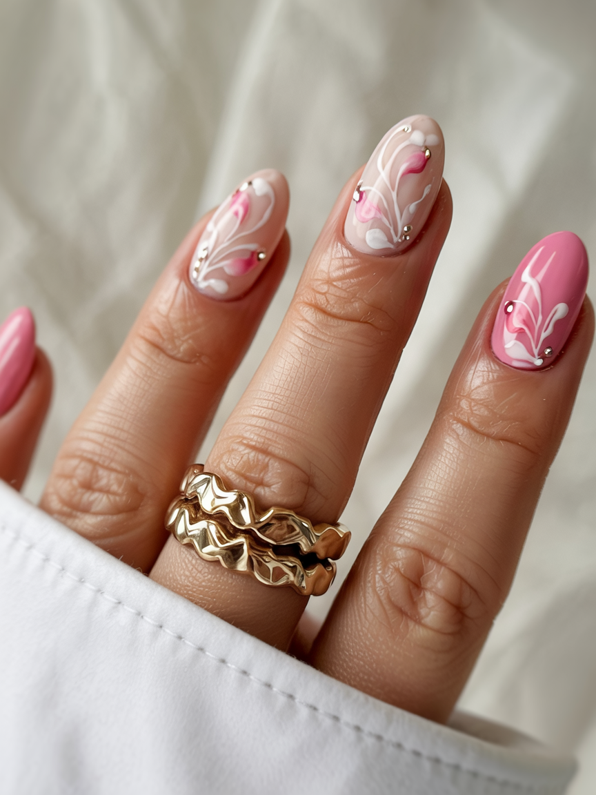 This design feels artistic and expressive, like wearing a tiny piece of abstract art on your nails. The flowing pink and white botanical lines give movement and softness, while the subtle shine keeps everything looking polished. It’s creative but still grounded—perfect if you like your style to have personality without crossing into “too much.”