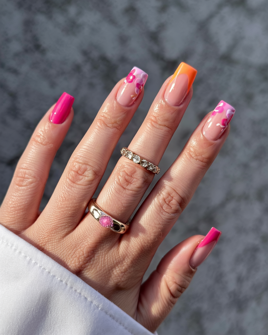 This look feels vibrant and full of life. The mix of pink and orange tips instantly energizes the design, while the floral accents soften it just enough. It’s expressive, confident, and perfect for women who enjoy color but still want a cohesive, stylish finish.