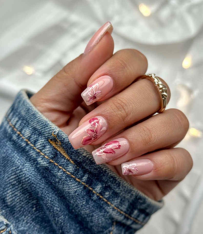What makes this design special is how balanced it feels. The flowers act as accents rather than the main event, which keeps the overall look refined. It works well on coffin or square nails and pairs beautifully with acrylic for extra durability. If you’re drawn to Designs in pink that still feel sophisticated, this is a lovely choice. Keep the base sheer and glossy to let the color details shine without overwhelming your hands.
