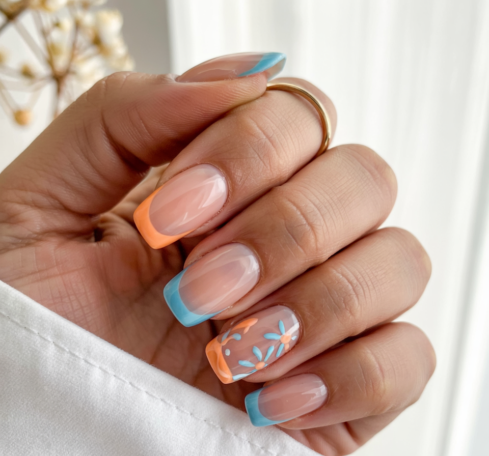 These nails feel energetic and creative, like a burst of color after a long winter. The blue and orange tips create a lively contrast, while the delicate botanical design softens the look just enough. It’s fun, expressive, and full of personality.
