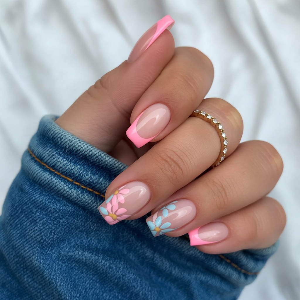 These nails feel joyful and expressive, like you let your creative side take the lead. The mix of pink and blue French tips paired with small floral designs gives this look a playful, artistic energy. It’s youthful, fresh, and perfect for embracing the lighter mood that spring brings.