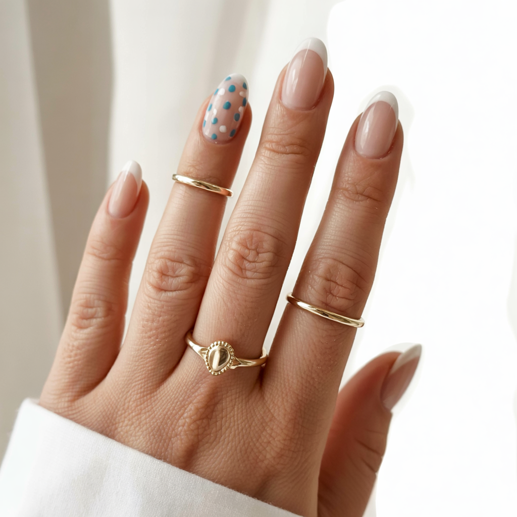 There’s something effortlessly chic about this look—it’s calm, clean, and quietly stylish. The classic French tip does most of the heavy lifting, while the single nail with light blue dots adds just enough personality to keep things interesting. It’s the kind of manicure that doesn’t shout for attention but always gets noticed in a subtle, “your nails look great” kind of way.