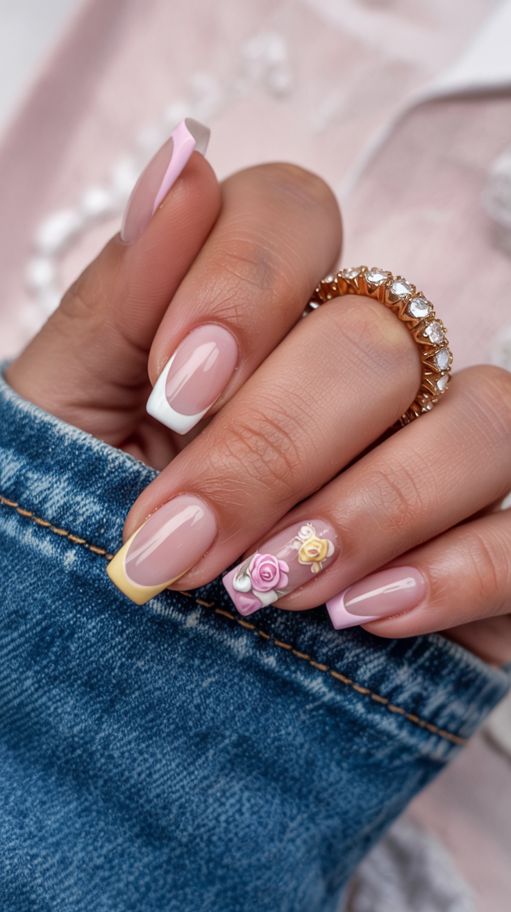 This manicure feels like a soft-focus photo—romantic, feminine, and a little dreamy. The pastel French tips keep the look light and airy, while the raised floral detail adds a touch of artistry that feels special without being flashy. It’s the kind of nail design that makes you feel elegant, even on an ordinary day.