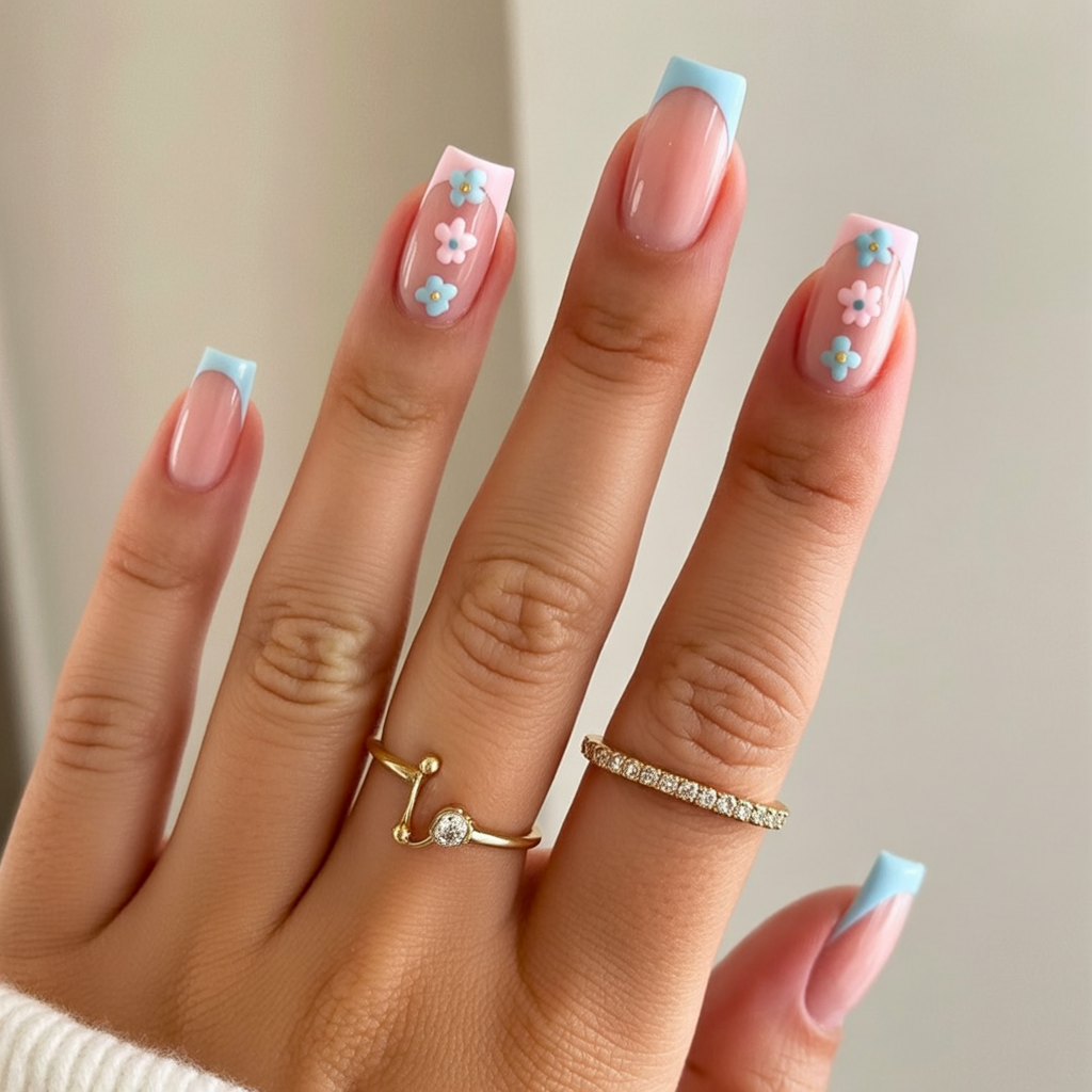 This set has such a happy, carefree vibe—it instantly makes you think of clear skies, fresh blooms, and that feeling of starting something new. The alternating blue and pink French tips bring a playful rhythm, while the tiny flower designs tie everything together in a sweet, cohesive way. It’s cheerful without being loud, and that’s a hard balance to strike.
