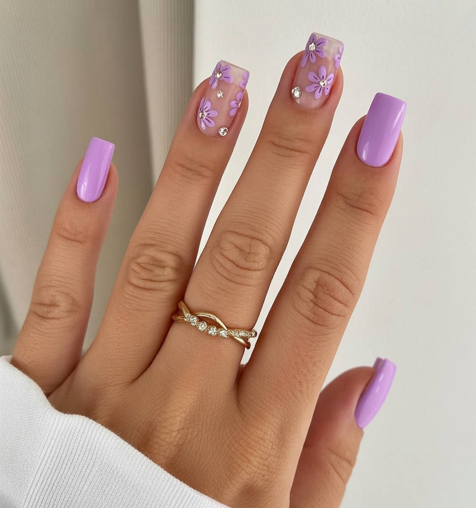 There’s something undeniably elegant about purple, especially when paired with soft floral designs. This manicure feels polished and feminine, with just enough sparkle to catch the light. It’s refined but not boring—perfect for women who like their nails to feel special yet tasteful.