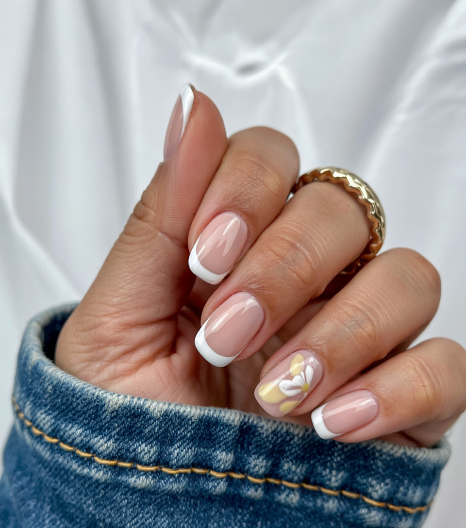 This manicure feels quietly charming, like a favorite white blouse you always reach for in spring. The clean French tip keeps everything classic and polished, while the single yellow flower adds a gentle, optimistic note. It’s subtle, feminine, and incredibly wearable—perfect if you love understated Designs that still feel special.