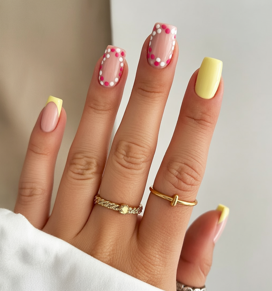 This manicure feels cheerful and a little bit nostalgic, like spring afternoons that stretch longer than expected. The soft nude base keeps things grounded, while the yellow accents and dotted border bring a playful, almost retro charm. It’s lighthearted but still polished—perfect for days when you want your nails to feel fun without looking overdone.