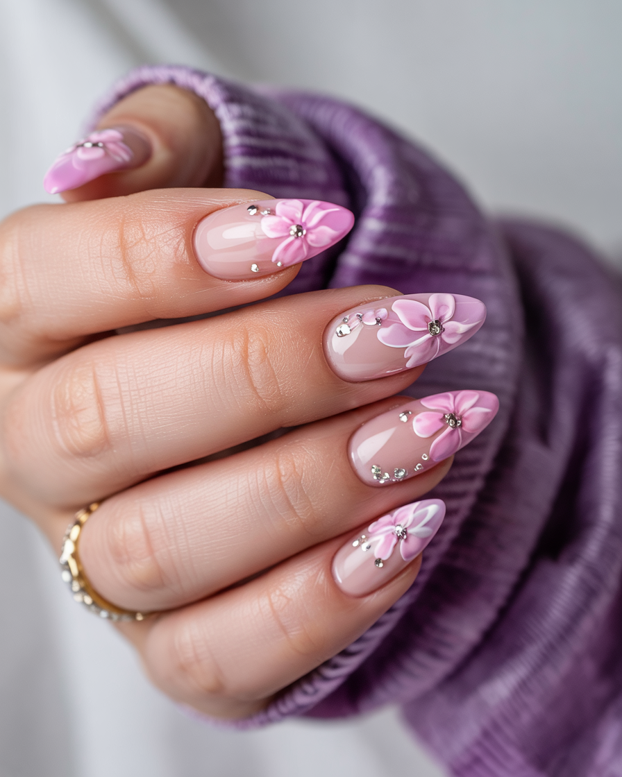 This look feels luxurious and feminine, with a soft, romantic glow. The pink base combined with raised 3D flowers and subtle sparkle creates a manicure that feels special and intentional. It’s the kind of design that makes you slow down and admire the details.
