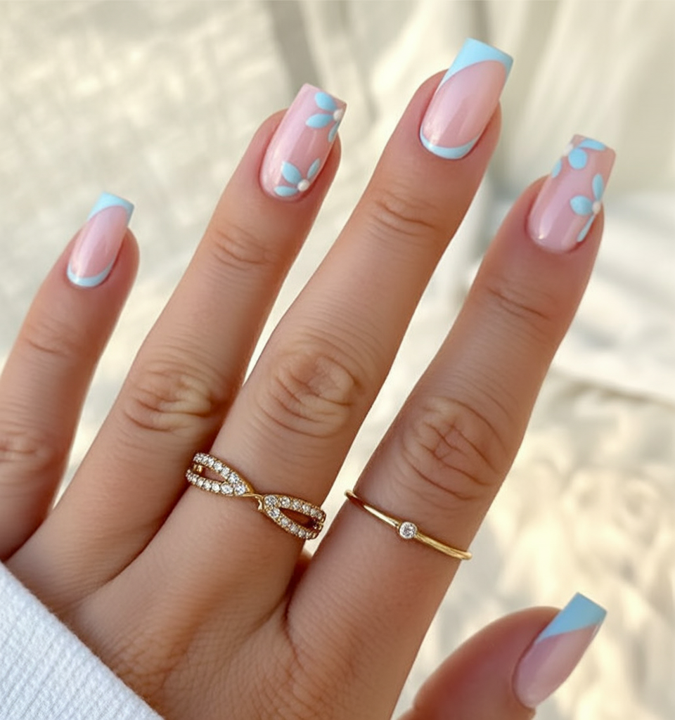 This manicure feels calm, airy, and very fresh—like open windows and clean linens. The light blue French tips add a cool, modern edge, while the soft floral accents keep the look gentle and feminine. It’s balanced, soothing, and quietly stylish.
