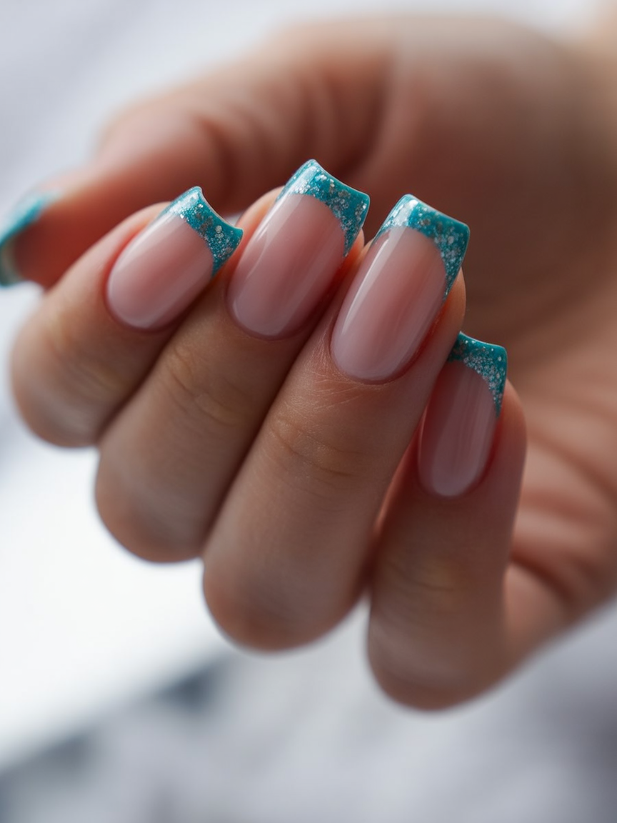 12. Blue Glitter French Tips with a Subtle Sparkle