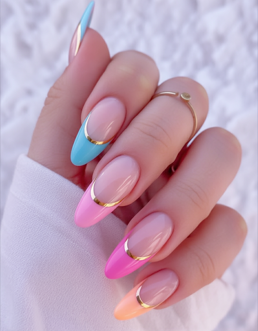 There’s something irresistibly soft and feminine about this look. The pastel tips—pink,designs blue,—pink, and orange—feelblue, light and joyful, while the thin gold line adds a touch of quiet luxury. It’s the kind of manicure that feels special without being flashy, perfect for spring days when you want your style to feel effortless and polished.