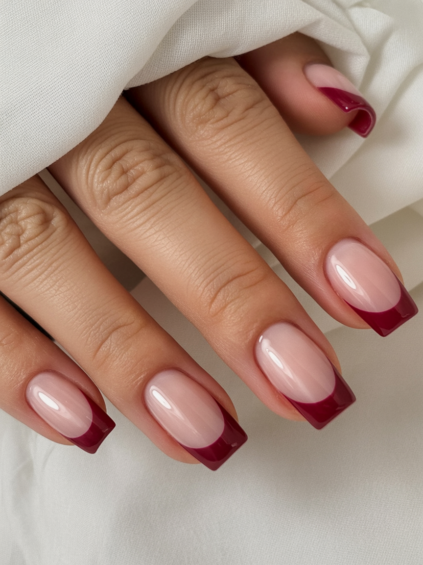 This manicure feels rich, elegant, and quietly powerful. The deep red tips add depth and drama, while the glossy nude base keeps the look clean and refined. It’s the kind of style that feels confident and mature, perfect for someone who appreciates classic beauty with a modern touch.