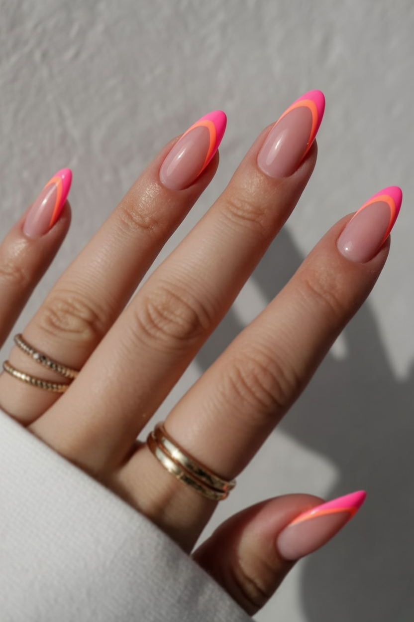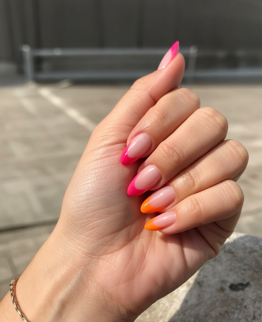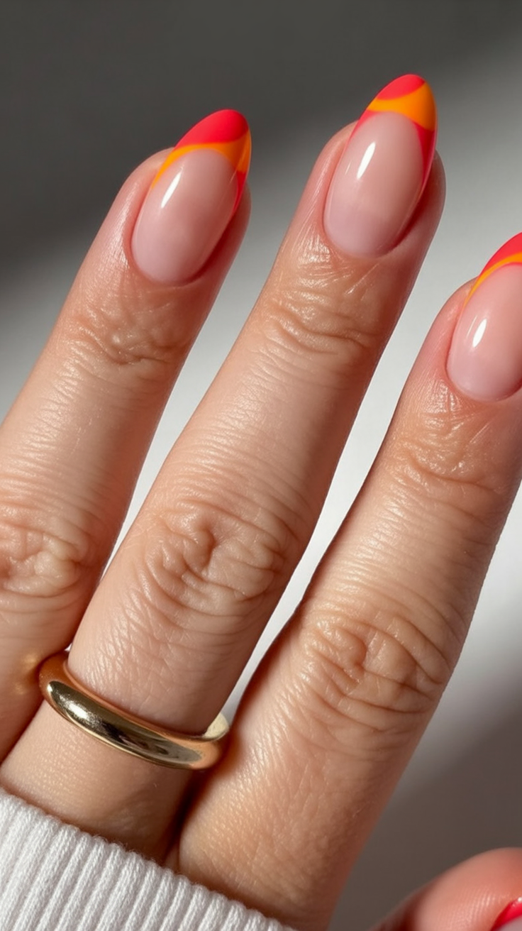 Compared to more traditional French tips, this version stands out thanks to its layered color effect. Almond shapes help soften the brightness, keeping the overall look balanced and pretty. orangeIf you usually stick to neutrals, this is a great way to experiment with colorspretty. while still feeling comfortable. It’s especially flattering on warmer skin tones and works beautifully with gold jewelry for a polished finish.