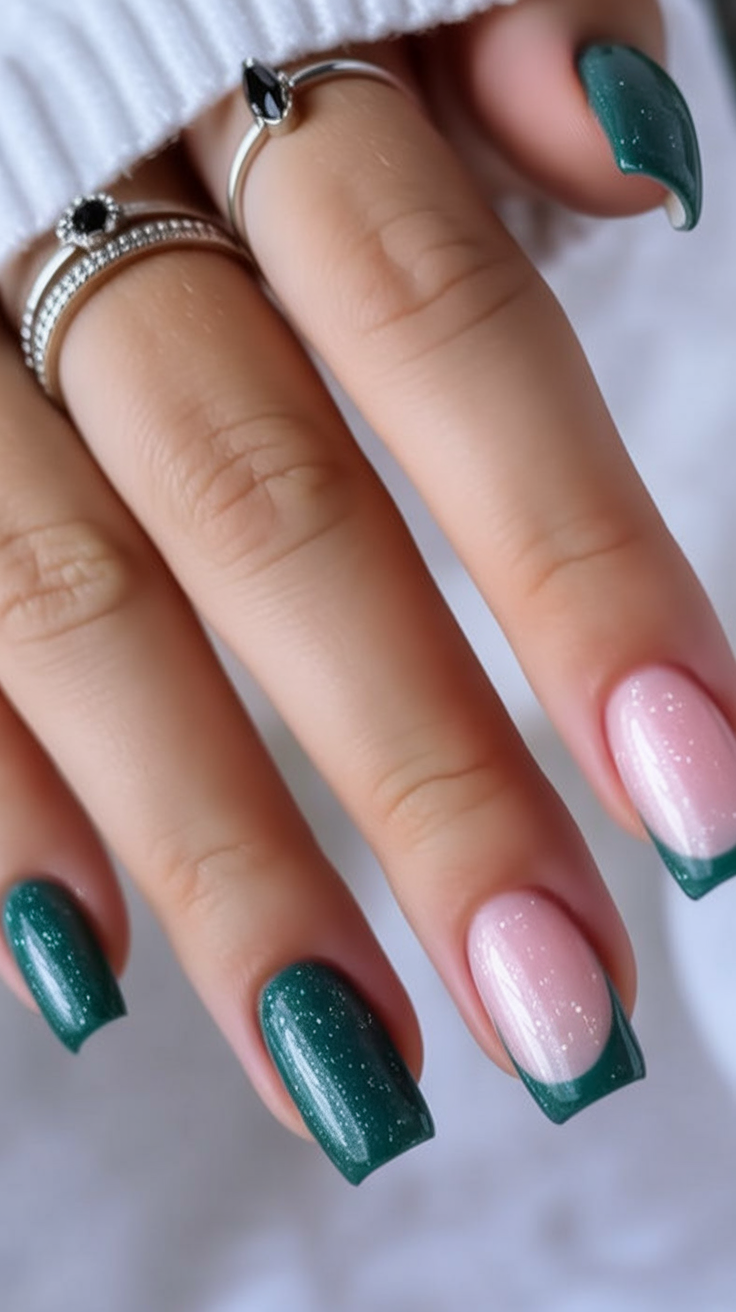 There’s something confident and grounding about this manicure. The rich greencolors tips feel bold yet balanced, especially against the soft pink base. It has a calm, almost luxurious mood—likegreen nature meeting modern style. This isn’t a playful spring look; it’s a more grown, intentional take on French tips that feels strong and self-assured.