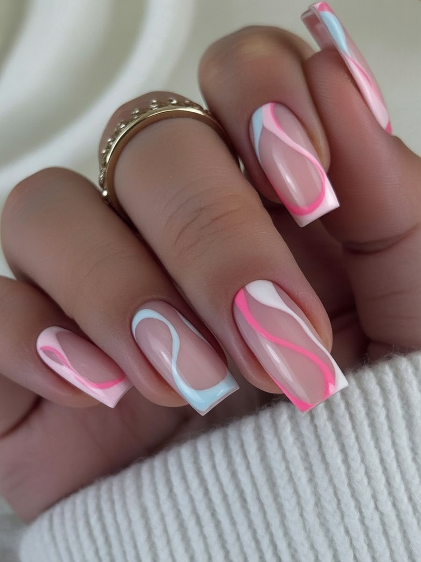 There’s a soft, artistic rhythm to this manicure that feels almost meditative. Gentle pastel lines in pink and blue move across a sheer base, creating a flowing design that feels modern and light. It’s creative without being overwhelming—the kind of nail look that feels expressive yet polished.
