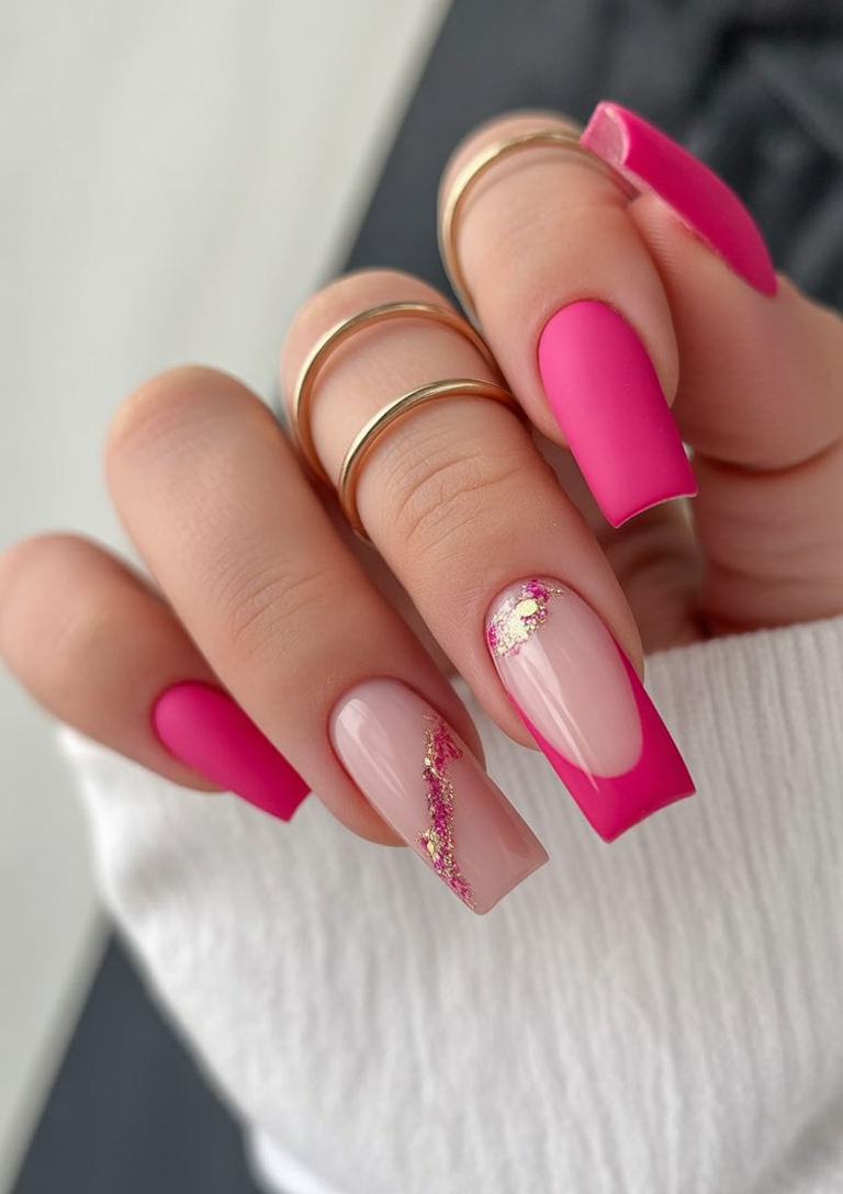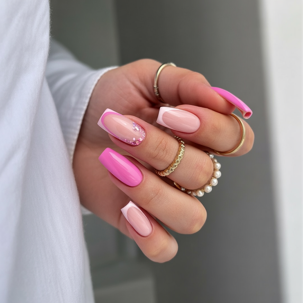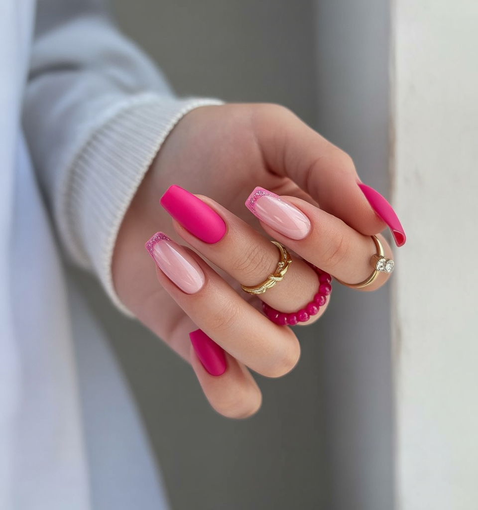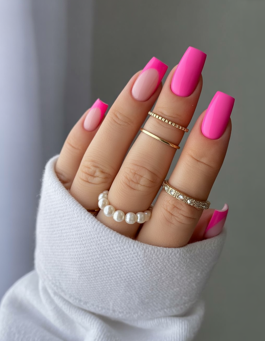 This manicure feels fresh, confident, and unapologetically fun. The crisp square shape paired with a bold pink French tip brings a modern edge to a classic idea. It’s youthful without being childish—the kind of look that quietly says you’re not afraid of color, even if your style is usually more neutral.