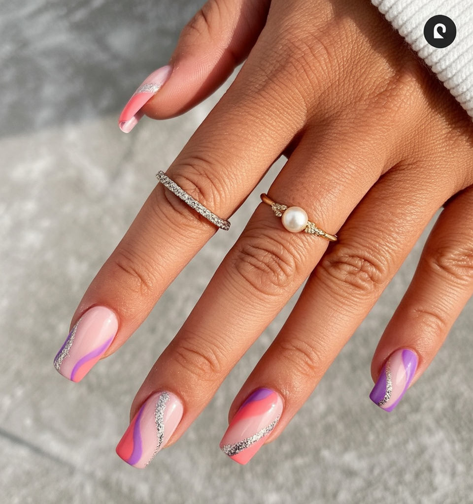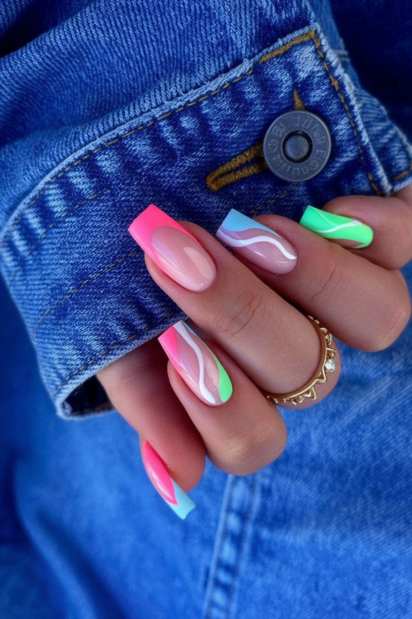 This manicure has a cheerful, carefree energy that feels perfect for spring. Soft pastel shades—including pink, blue, and green—flow together in playful wave designs that feel artistic without being overwhelming. It’s fresh, optimistic, and a little bit bold in the best way.