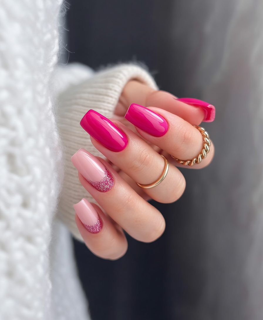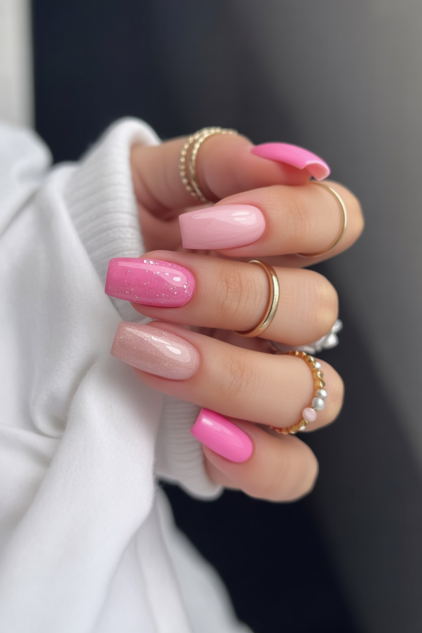This look feels cozy, feminine, and quietly luxurious. The mix of soft pink shades with gentle shimmer creates a manicure that feels comforting and polished at the same time. It’s the kind of style that looks beautiful up close and feels effortlessly put together.