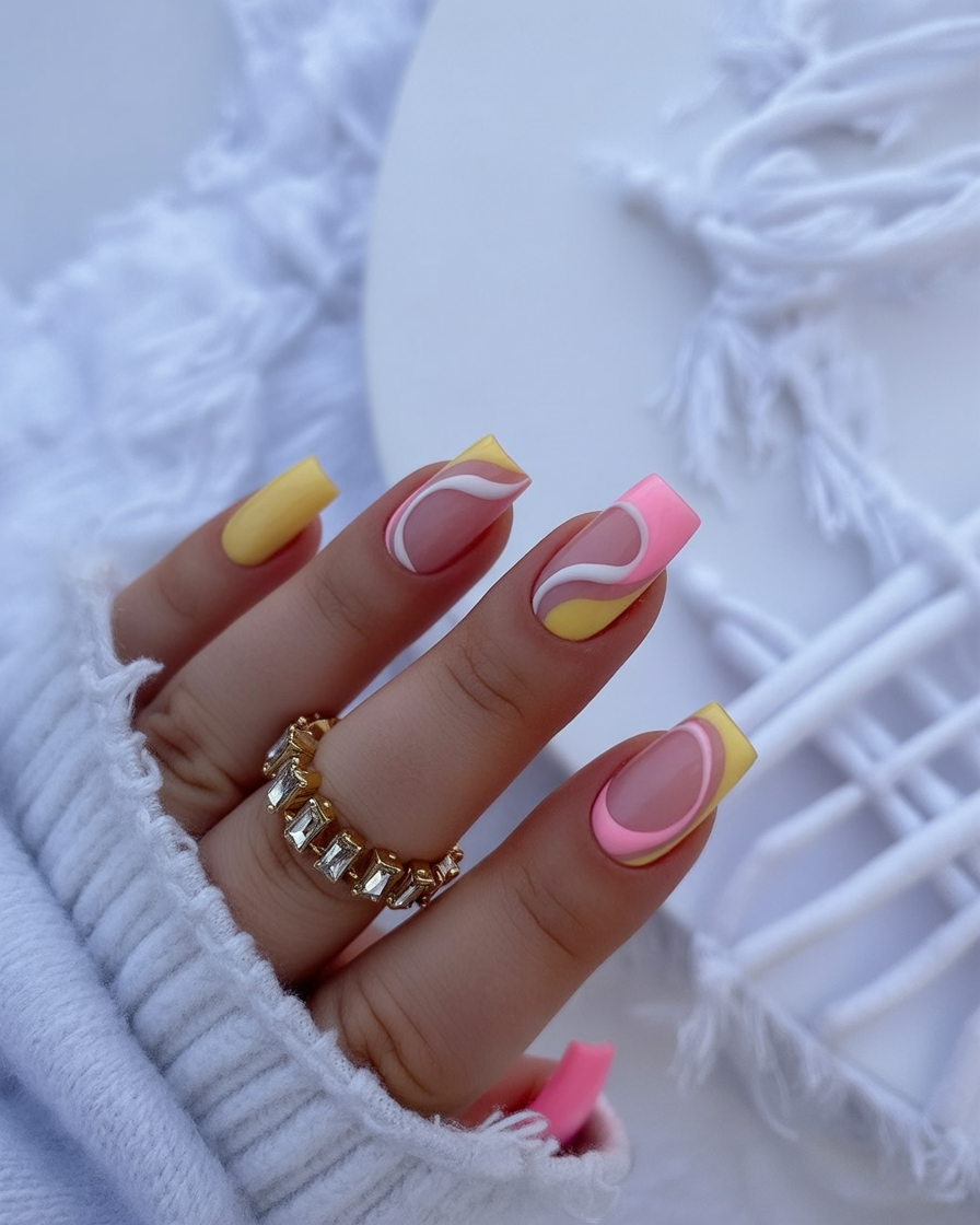 If you love experimenting with colors but still want something wearable, this is a great balance. The square shape keeps the look grounded, while the flowing design adds movement. It’s an easy way to embrace spring trends while keeping your nails polished and intentional.