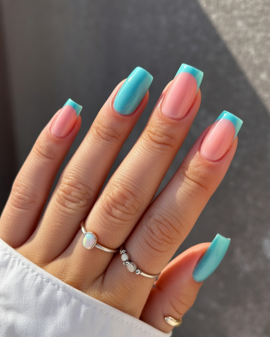 There’s something effortlessly cheerful about this look. The Aqua Blue tips feel fresh and optimistic, like clear spring skies, while the soft pink base keeps everything balanced and feminine. It’s playful without being too bold, making it an easy favorite for the season.