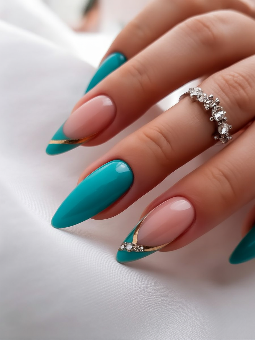 This manicure gives off confident elegance with a hint of drama. The rich blue-green color is deep, while the light nude and gold curve detail gives it a classy finish. It’s great for those polished women who want to make a statement.