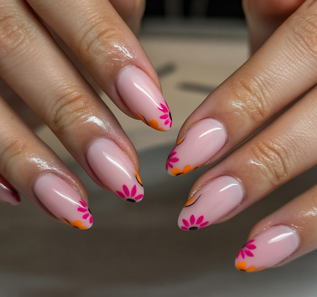 There’s something quietly uplifting about this look—like fresh flowers on a kitchen table in early spring. The soft pink base feels gentle and polished, while the small floral details add just enough charm without tipping into anything too sweet. It’s the kind of manicure that feels thoughtful and calm, perfect for women who love subtle beauty with a personal touch.