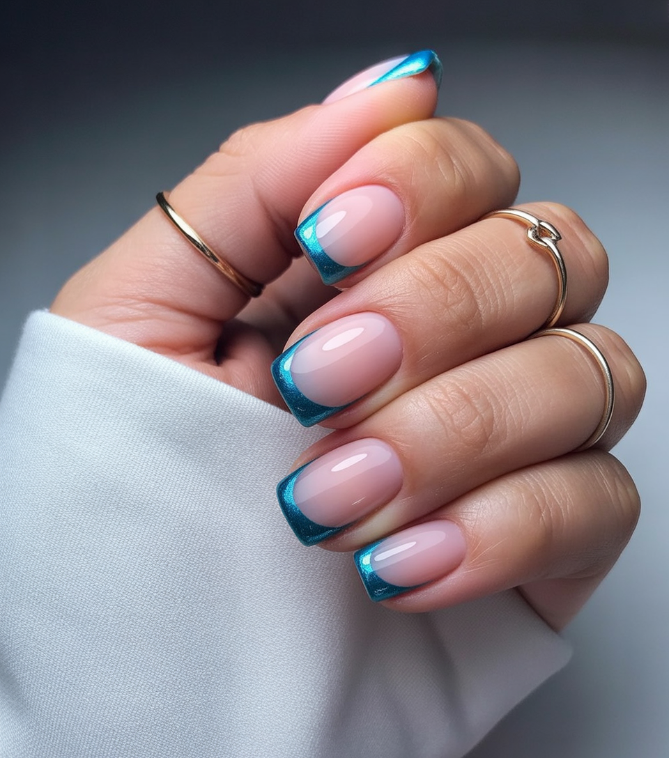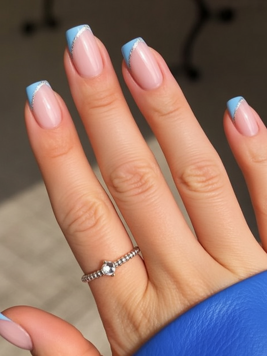If you’re curious about trends but prefer a clean finish, this French tip variation is a great choice. The square shape offers durability, and the color placement helps nails look neat as they grow. It’s a lovely way to introduce blue into your nail ideas without overwhelming your look.