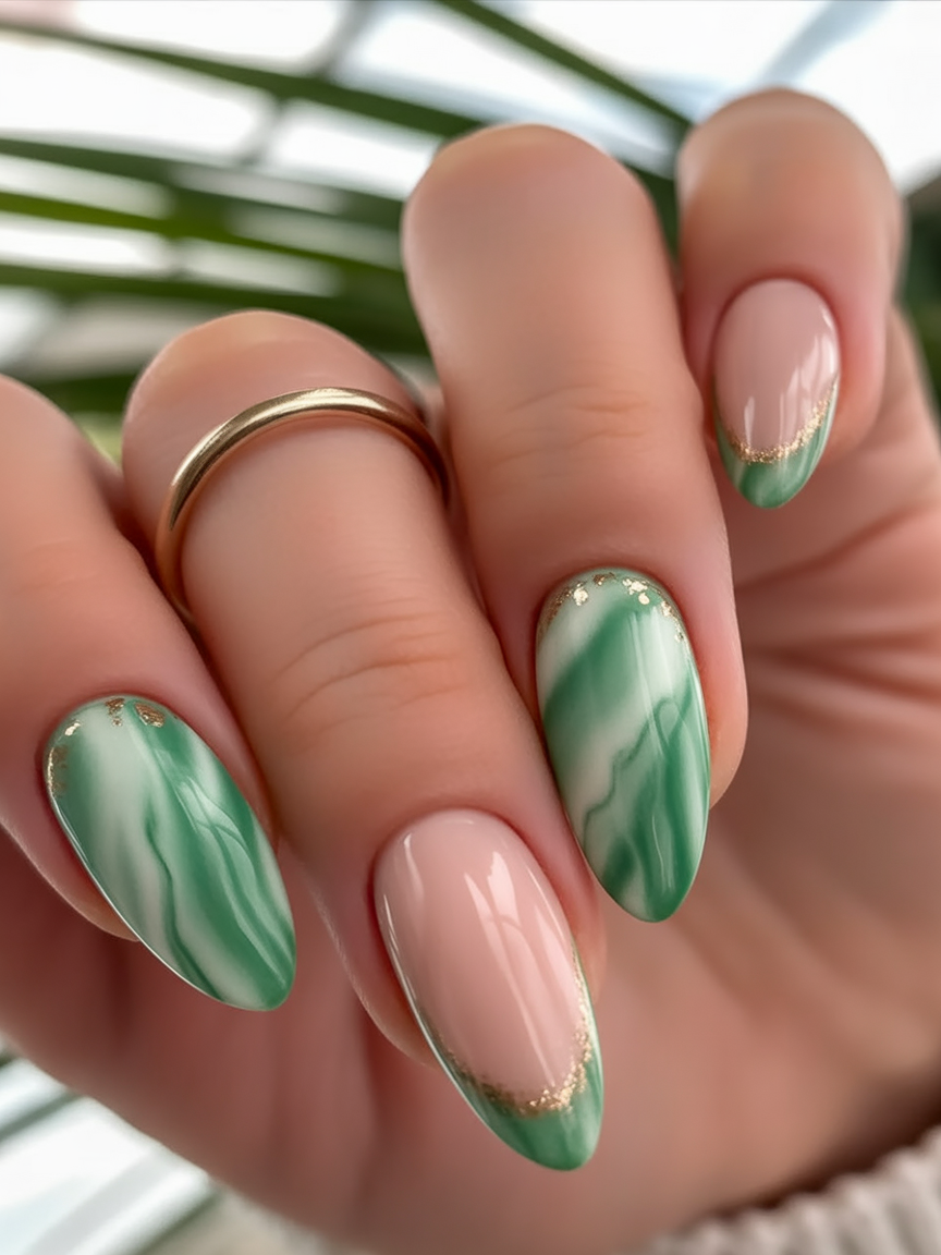 This look feels calm, natural, and quietly luxurious. The soft green marble effect brings a sense of freshness, almost like new leaves in early spring, while the gold accents add warmth and refinement. It’s sophisticated but relaxed, perfect for women who appreciate understated beauty.