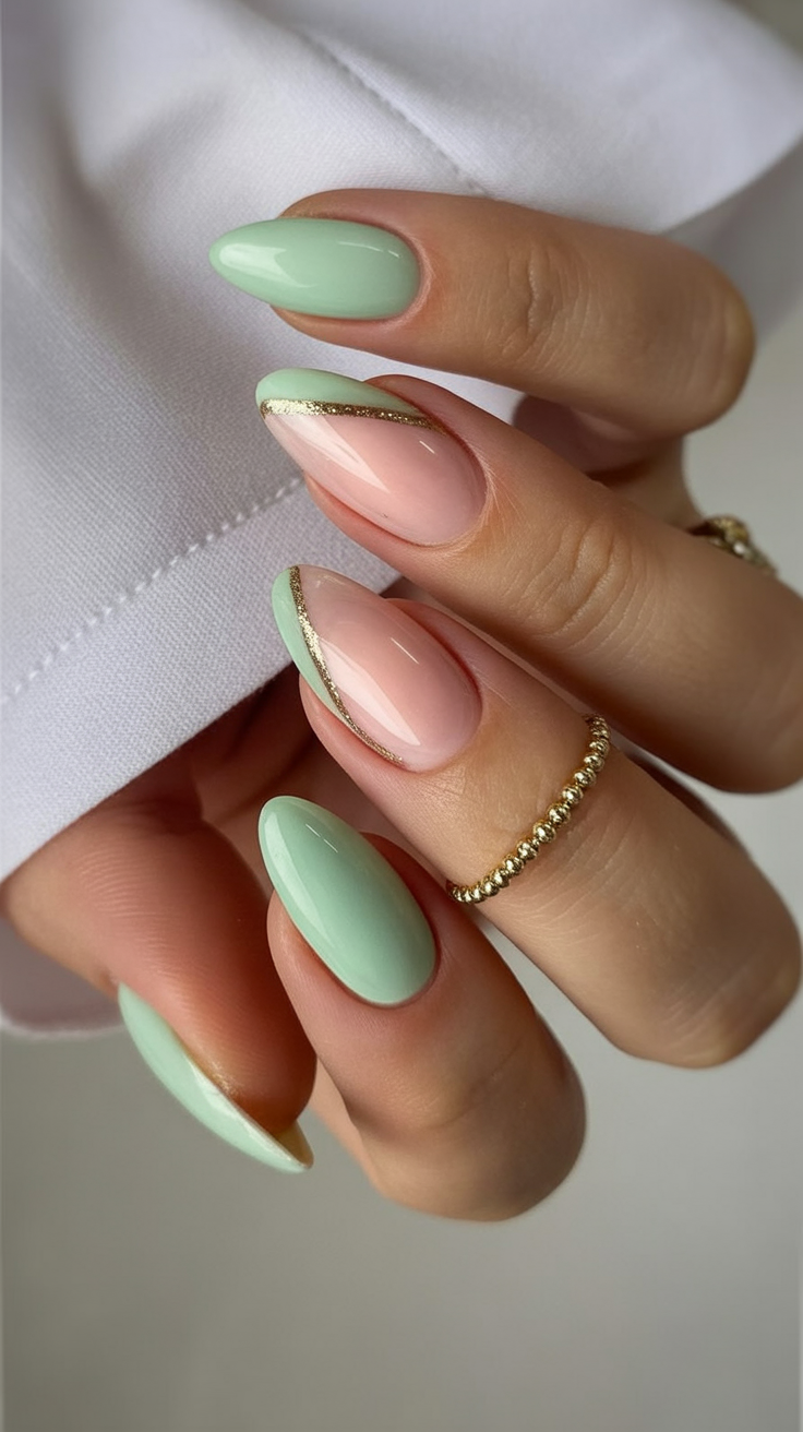 This style is perfect if you enjoy designs that feel intentional but not overworked. The almond shape enhances the softness, and the subtle gold detail adds interest without overpowering the look. A lovely choice for spring when you want something fresh, natural, and quietly stylish.