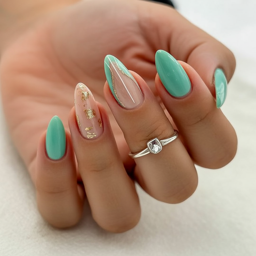 This manicure feels artistic and refined, with just enough detail to feel special. The soft green shade is calming and modern, while the gold foil accents add a delicate shimmer that catches the light beautifully. It’s elegant without feeling formal.