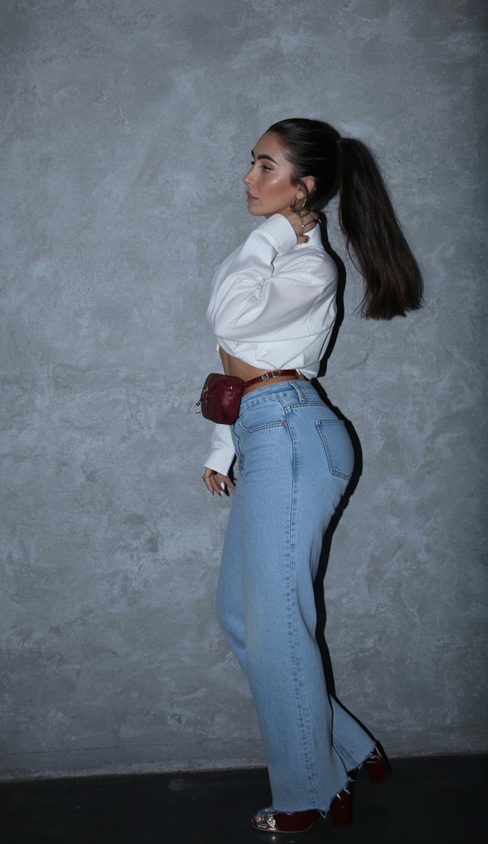 This look feels timeless with a twist—classic denim paired with a cropped white shirt that feels fresh and modern. It’s giving Western simplicity mixed with European polish, the kind of outfit that always feels right no matter the season.
