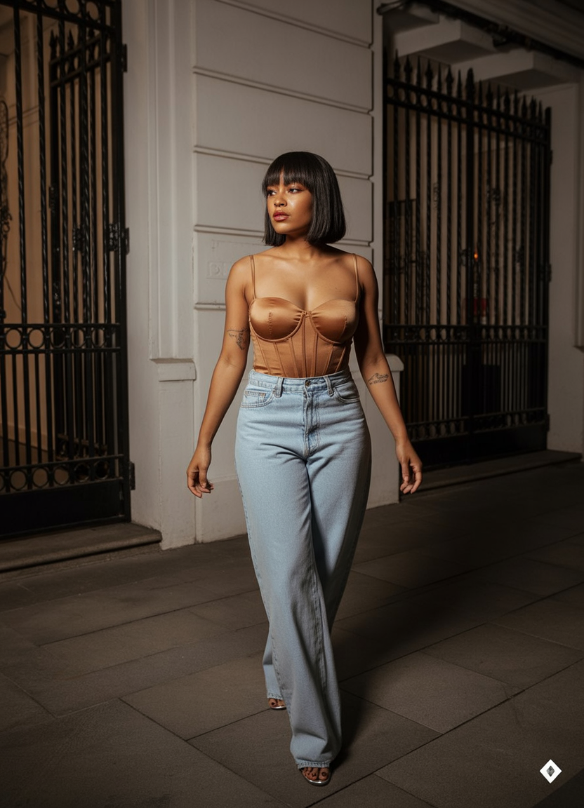 This look has a quiet drama to it—tailored denim, a sculpted top, and that confident walk that says you know exactly where you’re going. It feels inspired by Paris in the early evening, when style is sharp but never loud. There’s elegance here, but also ease.