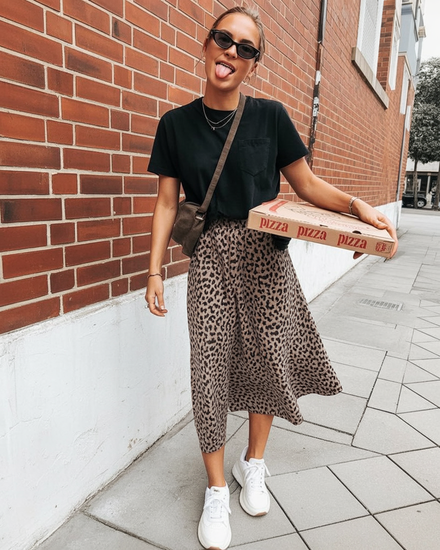 This look is pure personality. A graphic tee with a flowing leopard skirt feels fun, confident, and just a little rebellious—in the best way. It has that baddie energy without trying too hard, perfect for spring days when you want comfort with flair.