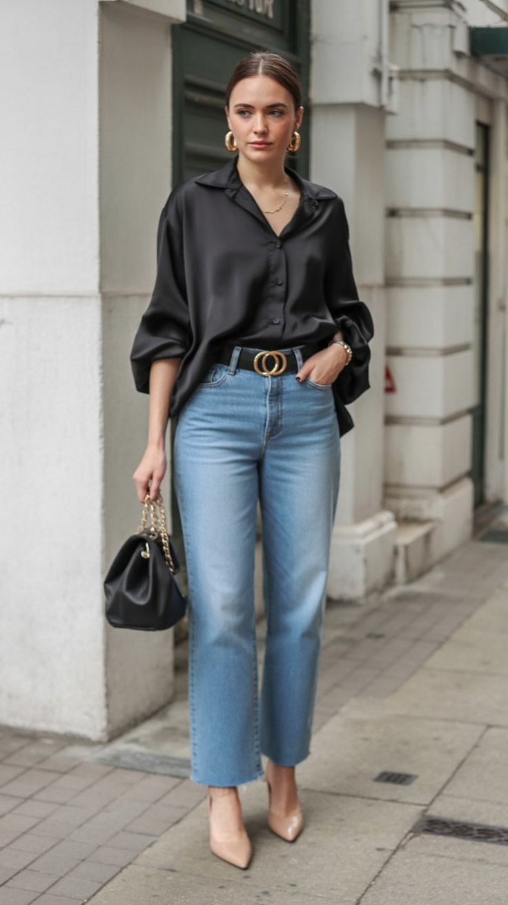 There’s something undeniably powerful about a black satin shirt—it brings confidence, elegance, and just a hint of edge. Paired with classic denim, this look feels very Paris in the evening or London on a stylish weekday. It’s understated but strong, perfect for a woman who knows her style.