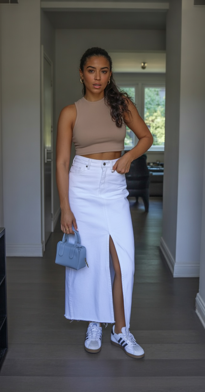This look feels modern, confident, and very wearable. The neutral crop top paired with a white denim skirt creates a soft contrast that feels clean and spring-ready. It’s minimal but expressive, perfect for women who love subtle style statements.