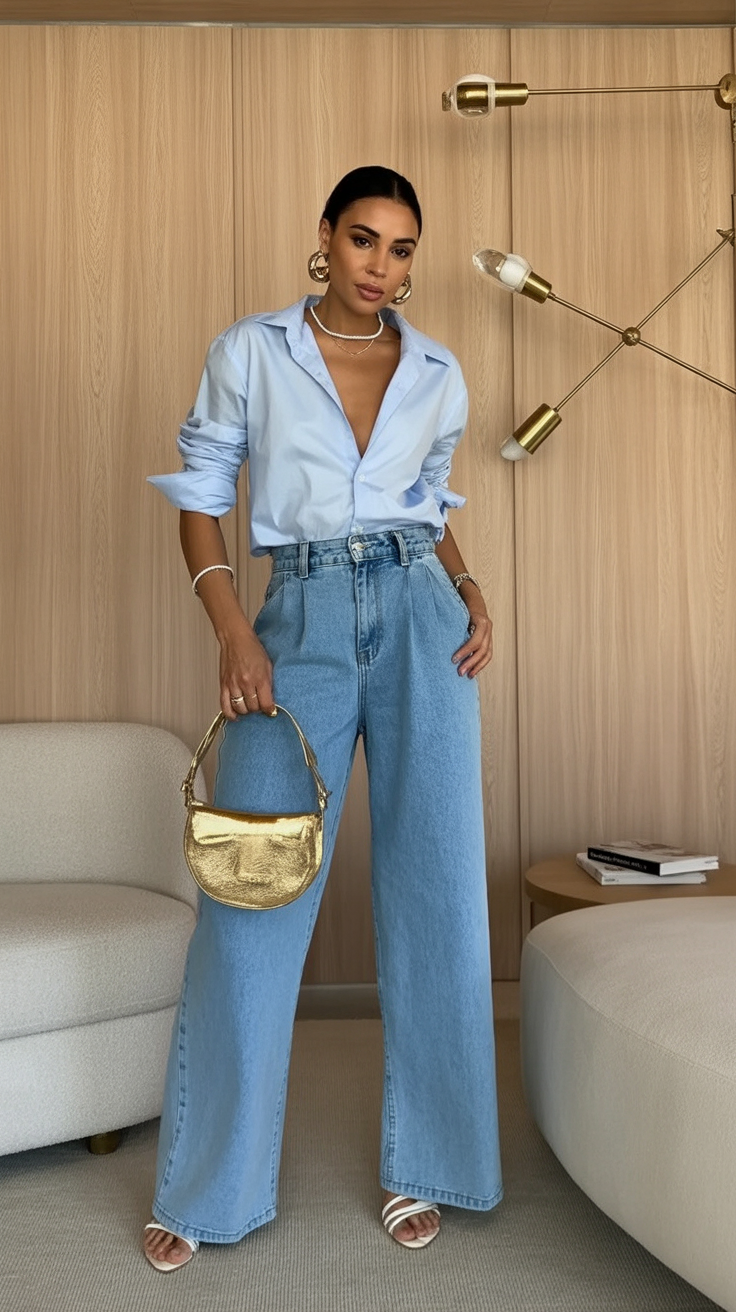 18. Light Blue Shirt with Wide-Leg Denim Elegance