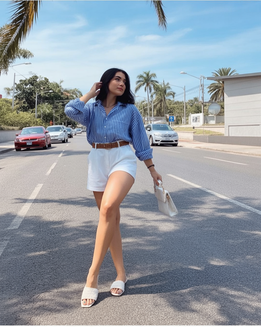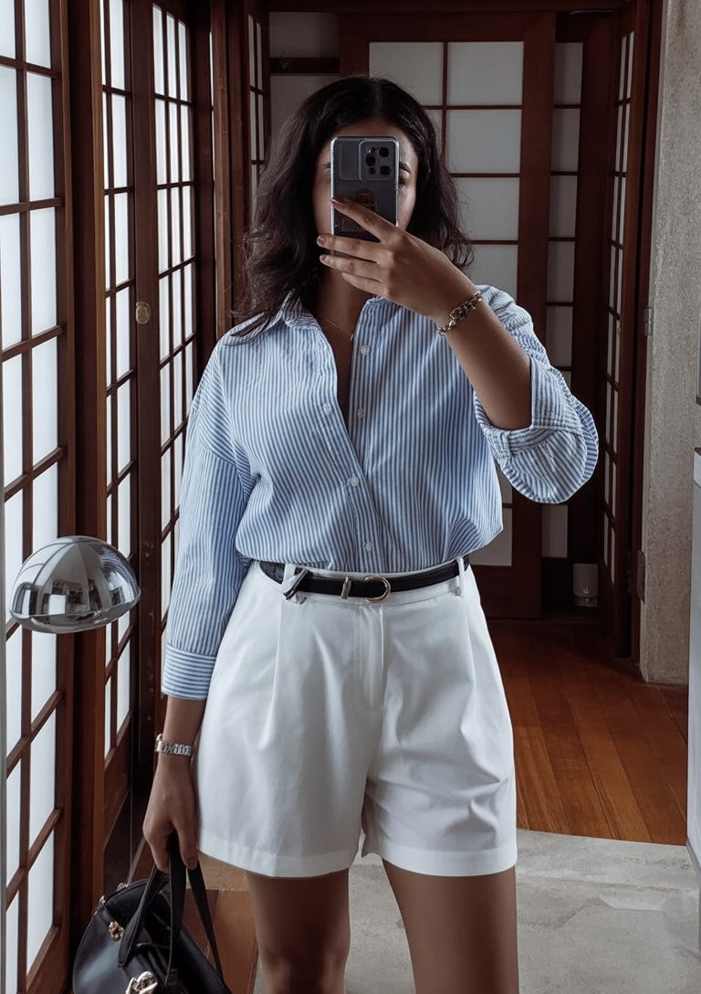 This look instantly feels like a warm spring day somewhere between Barcelona and the Italian coast. The blue striped shirt brings that relaxed, sun-kissed confidence, while the white shorts keep everything clean and fresh. It’s effortless, feminine, and quietly stylish—the kind of outfit that looks great even when you’re just walking down the street.