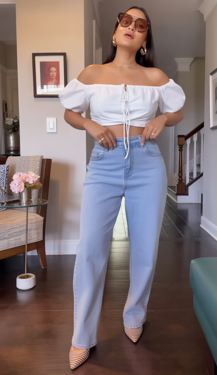 This look feels soft, feminine, and quietly confident. The off-shoulder white top brings a touch of romance, while the light denim keeps it grounded and wearable. It’s the kind of outfit that feels just as right at home as it does stepping out for a casual dinner.