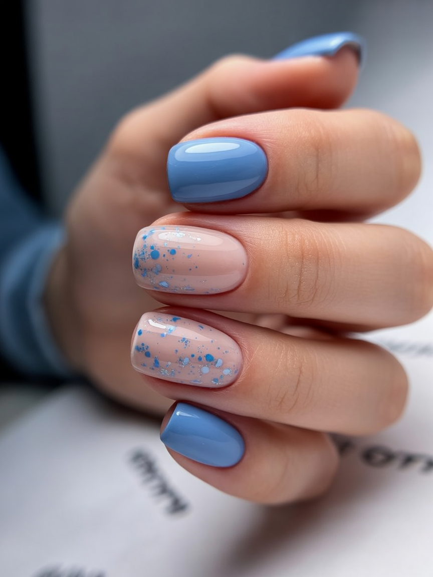 This design feels calm, creative, and a little artsy, like a quiet afternoon spent painting near a window. The soft blue paired with a translucent base and scattered speckles gives the nails personality without overwhelming the look. It’s subtle nail art that feels grown-up, thoughtful, and effortlessly stylish—perfect for someone who loves detail but prefers restraint over drama.