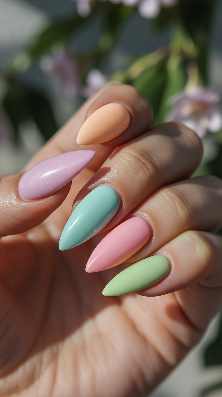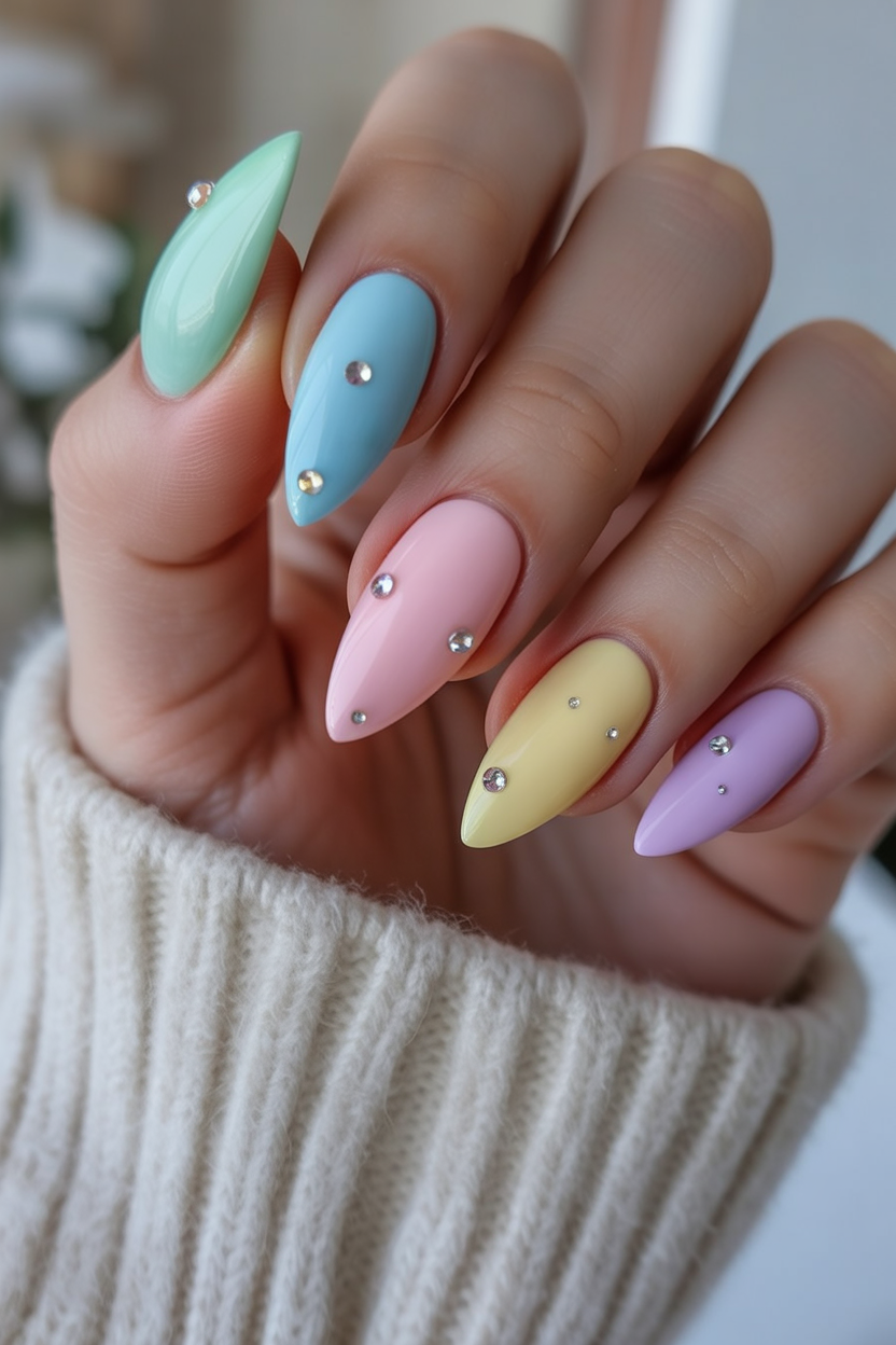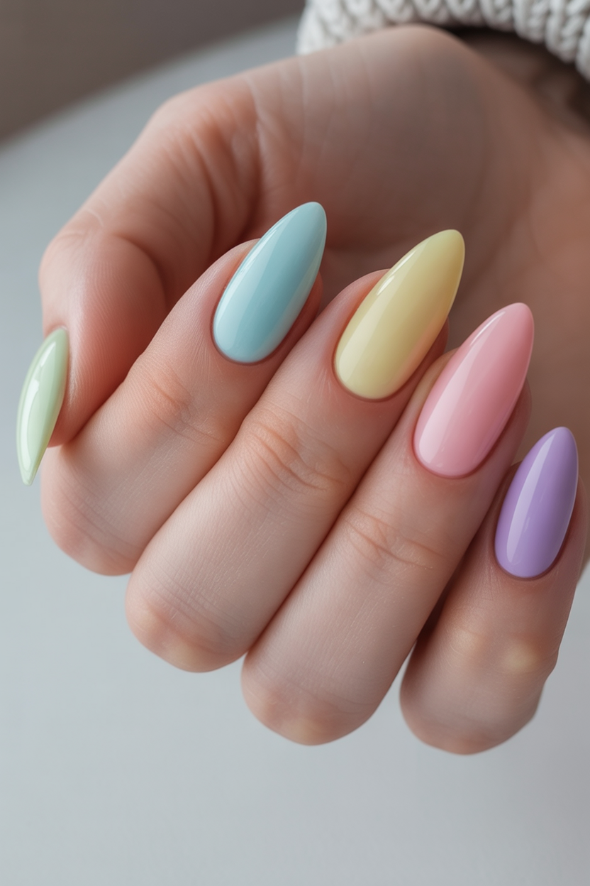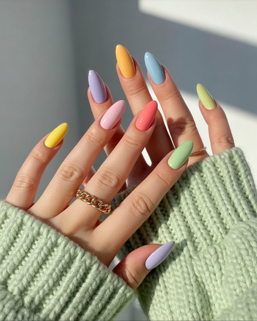 Almond shapes are especially flattering if you want to elongate the fingers and keep things feminine. This look works best on acrylic almond nails to keep the pastel colors smooth and even. It’s a great choice if you like variety without complicated designs. Pair it with neutral outfits or cozy knits so the nails feel like a natural extension of your style.