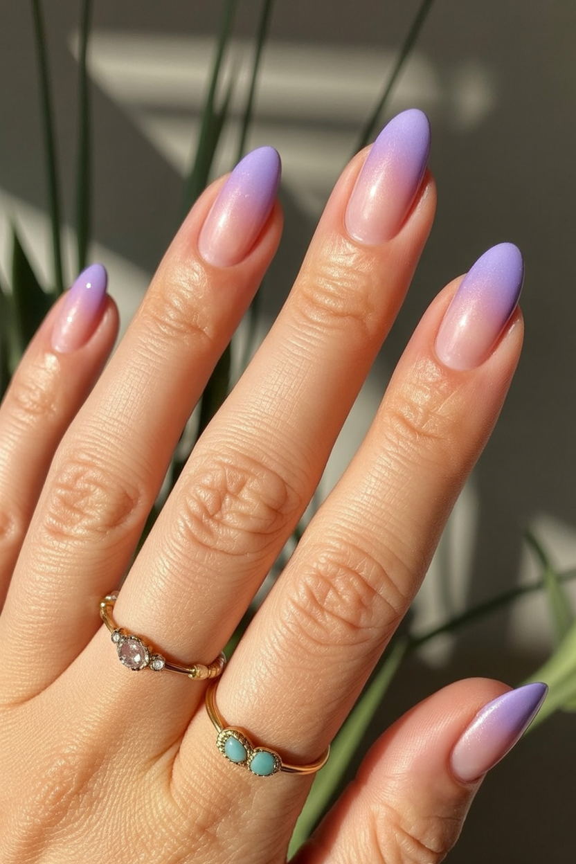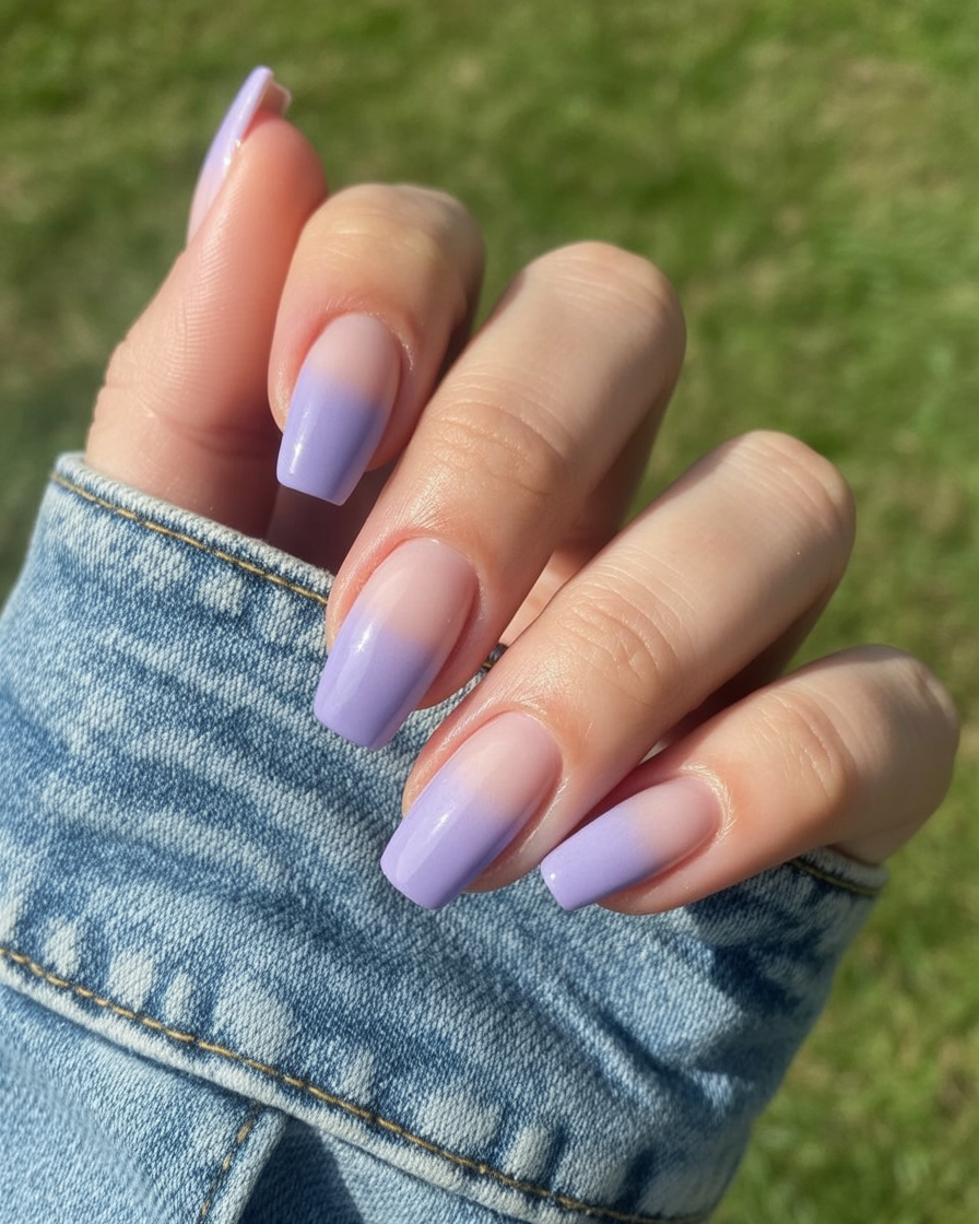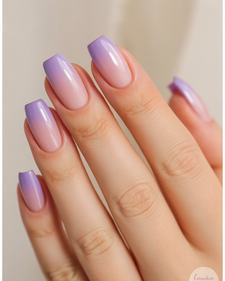 There’s something incredibly calming about a soft lavender ombre. The gentle fade from natural pink to pastel purple feels elegant, serene, and quietly confident. It’s the kind of manicure that doesn’t shout for attention but always looks polished, no matter what you’re wearing or where you’re headed.