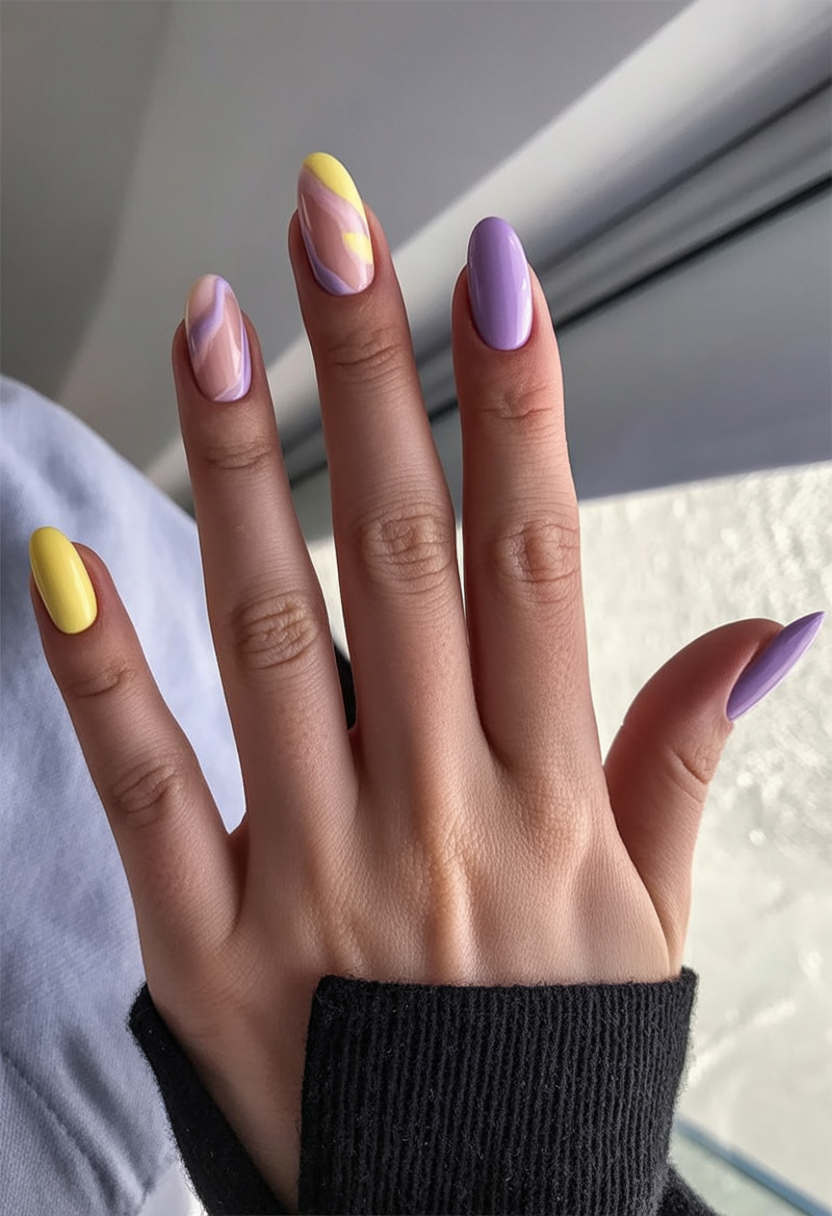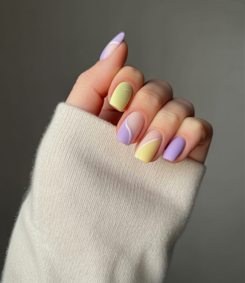 This manicure has a soft artistic twist that feels modern and thoughtful. The curved pastel accents in yellow and lavender add gentle movement to the nails, giving them personality without feeling busy. It’s subtle nail art that feels calm, creative, and very spring-appropriate—perfect if you like details that reveal themselves slowly.