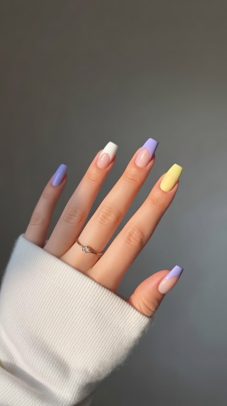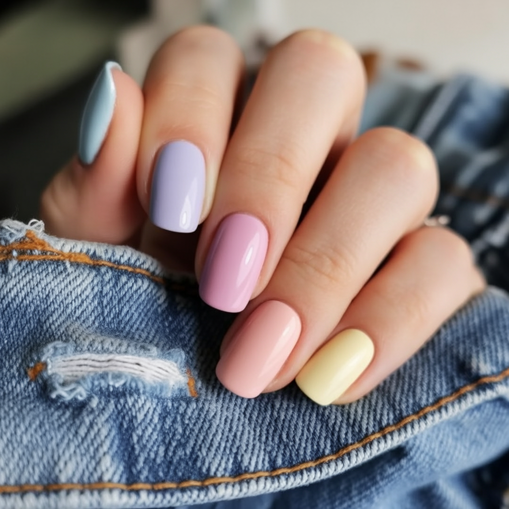 There’s something effortlessly charming about this short pastel mix. The soft lavender, blush, pale yellow, and muted blue feel relaxed and approachable—like your favorite cozy denim jacket paired with a simple tee. It’s casual, warm, and quietly stylish, perfect for spring days that don’t require anything too bold.