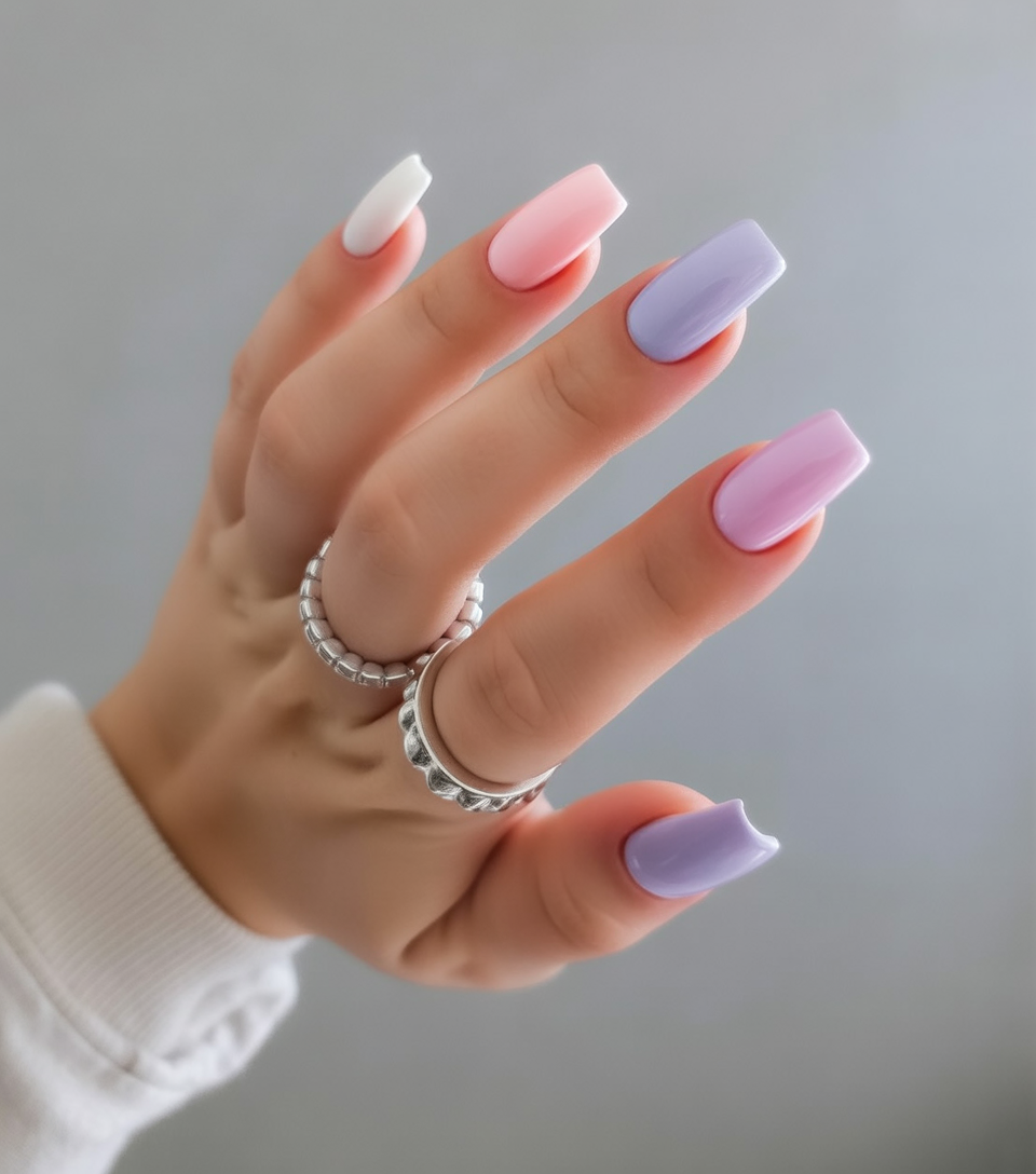 This manicure makes a confident statement while still staying within a pastel palette. The mix of white, soft lilac, blush, and a deeper purple adds contrast and depth, giving the look a modern, fashion-forward feel. It’s bold in the most tasteful way.